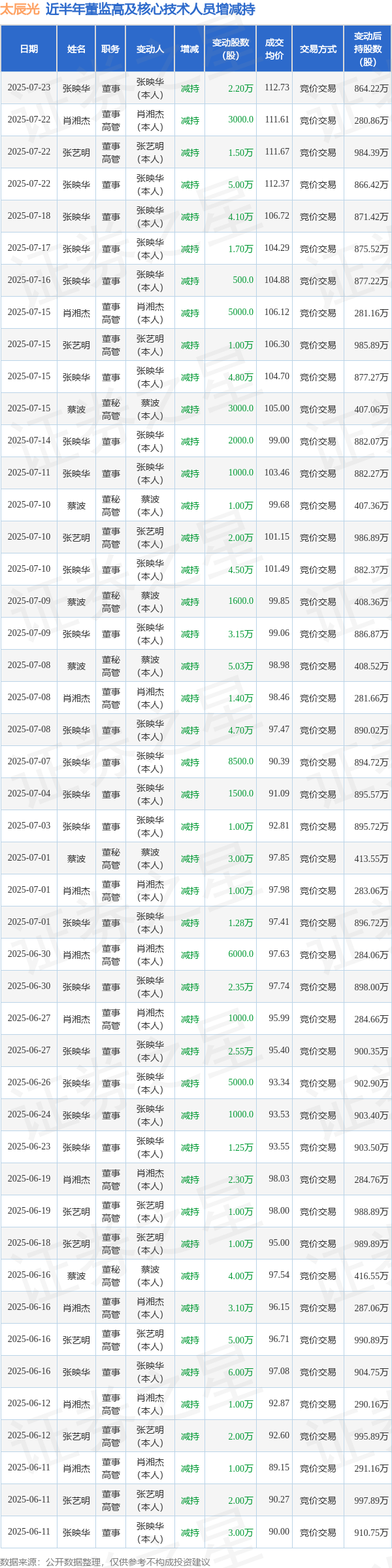 太辰光近半年内的董监高及核心技术人员增减持详情如下: